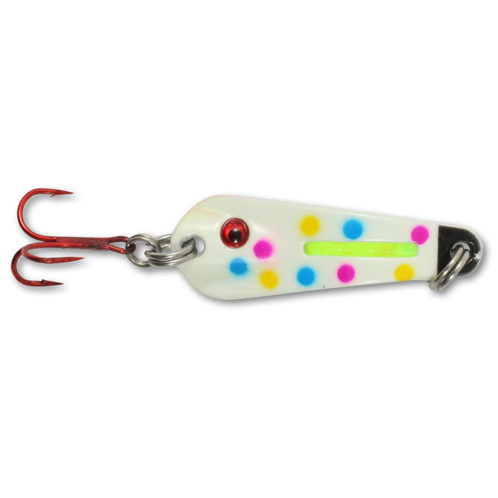 Each Northland Tackle Glo-Shot Spoon 1/16 Oz Qty 1 comes with red #8 treble hooks attached via dual split rings, providing added action and reducing the chances of lost fish. Whether you’re twitching, lifting, or letting it fall, this spoon excels in every scenario.