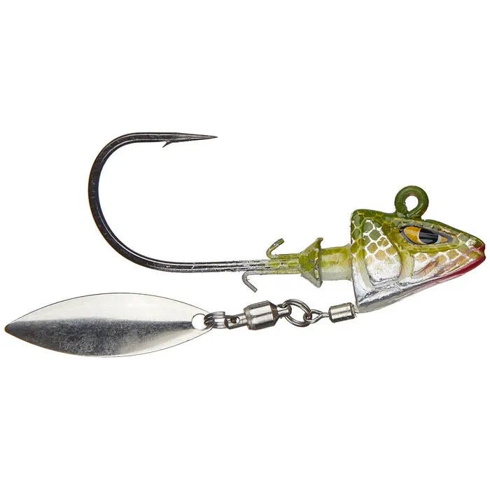 The Mustad Underspin Shad is a swimbait underspin jig head based off Mustad's Shad Darter Head swimbait jigheads. They feature a flashy silver Willow blade attached to the head via a premium Mustad Ball Bearing Swivel that creates tons of flash and fish-attracting vibration. The heads also have a custom "mean eye" paint job for added attraction. Built around a heavy-wire, Opti Angle Needle Point Mustad 32786NP-BN jig hook with a dual-barb baitkeeper to firmly hold baits in place.