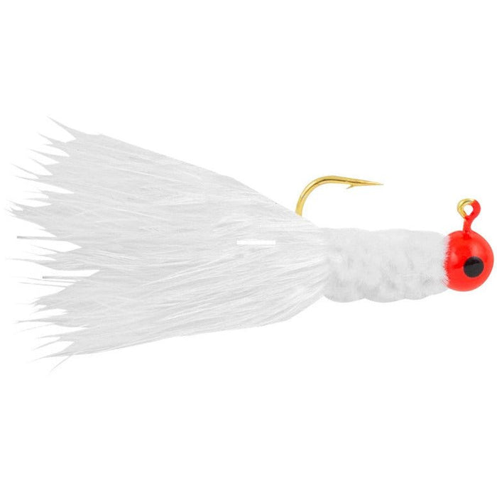 Crappie jig 1/16 ounces. Handcrafted by experienced tiers using select materials. Full, pulsating marabou tails. Carefully painted heads. Crappie jigs are handcrafted by experienced tiers using select materials. Full, pulsating marabou tails and carefully painted heads with dotted eyes are a further mark of quality. Packaged 3 per pack.