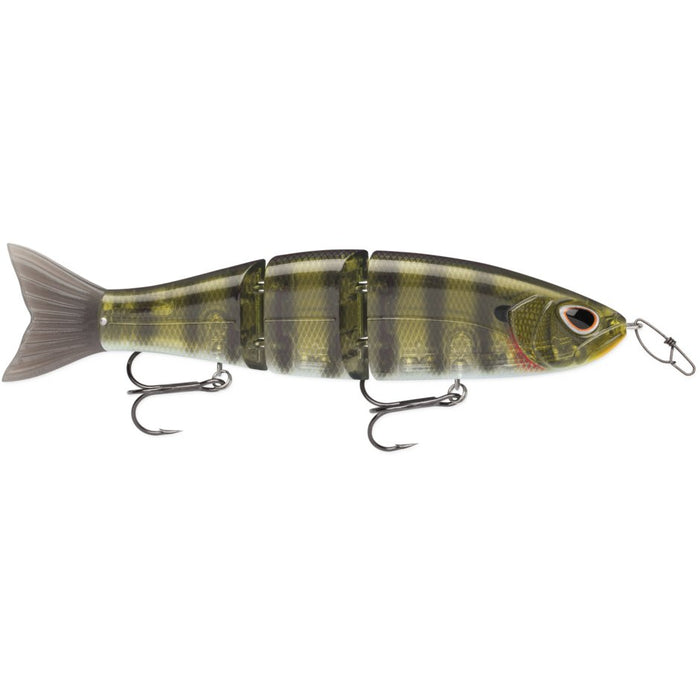 The Storm Arashi Swimmer Jointed Bait is a streamlined, slim, and detailed swimbait for when you really want to burn the retrieval. This seven-inch long, three-piece jointed swimbait attracts those cruise-feeding large predators, especially smallmouth and largemouth bass, in open water situations. Crank fast, stop, crank fast again, stop and repeat. A weighted bottom and a low center of gravity help keep the bait running just below the surface of the water. Burn the retrieval on either a dedicated swimbait or on a larger crankbait rod. The strikes are ferocious! A rotating line tie at the head eliminates the need for your own snap swivels, reduces the line twist on your cast, runs true at all angles, and creates a head wobble for realistic baitfish action. Swiveling hooks increase catch ratio and the swimbait includes a spare tail. The premium color finishes were chosen to match regional prey. You're going to have some fun with a Storm Arashi Swimmer Jointed Bait!