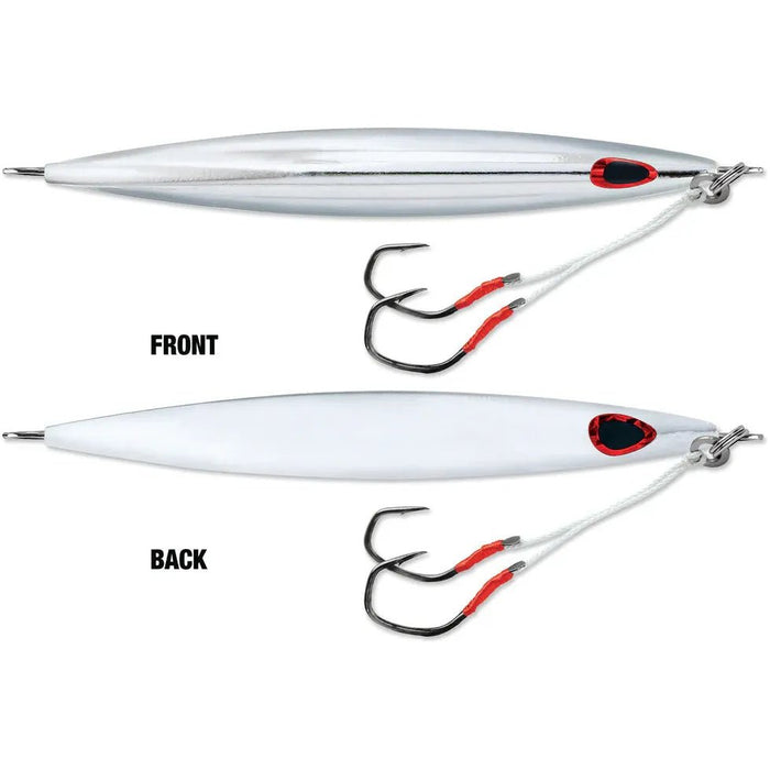 - In-line eyelets stabilize the jig during the fall and accentuate the lure's fluttering action on slackline.